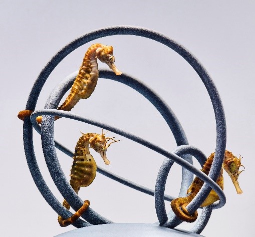 本企画展には、大きな水槽の中では気づきにくい、小さないきものたちの「カタチ(姿)」と「くらし(棲み処)」の関係性を表現し、いきもののことをより知ることで、いきものをより身近に感じていただきたいという想いを込めています。ミスジリュウキュウスズメダイやビッグベリーシーホースなど、個性豊かで小さないきものたちを、飼育スタッフが監修した6つの水槽展示でご覧いただけます。いきものの体の形や色、模様は、住んでいる場所やその習性などに基づいています。いきものたちの「カタチ」の由来がわかる「くらし」の特徴を、「ぐるぐるの家」「だんだんの家」などテーマを設けた独創的なデザインで表現しています。