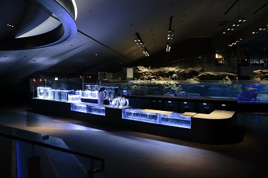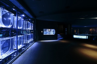 同じリニューアルで誕生したアクアベースの「ラボ」は飼育や繁殖の様子を公開。飼育スタッフとのコミュニケーションを通じてもっとクラゲを好きになってほしいという思いを込めて、話しやすいオープンな作りにしました。