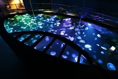 6階「クラゲ」エリアは、当館で繁殖、育成した14種類のクラゲを展示しています。日本近海で目にすることの多い中型のクラゲから、大型のクラゲ、特殊な形状をしたクラゲまで展示。2020年7月のリニューアルで誕生した「ビッグシャーレ」は、長径7メートルの円盤型の水槽で、中には約500匹のミズクラゲが漂い幻想的な空間を演出しています。
