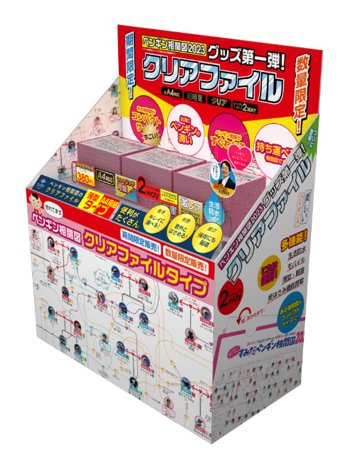 身近に置いてじっくりと「ペンギン相関図」を楽しんでいただきたいとの思いから、数量限定で相関図のクリアファイルを販売します。気になった方が買い忘れることがないように目立たせた特設商品棚には、思わず手に取りたくなるような楽しいコピーを掲載します。