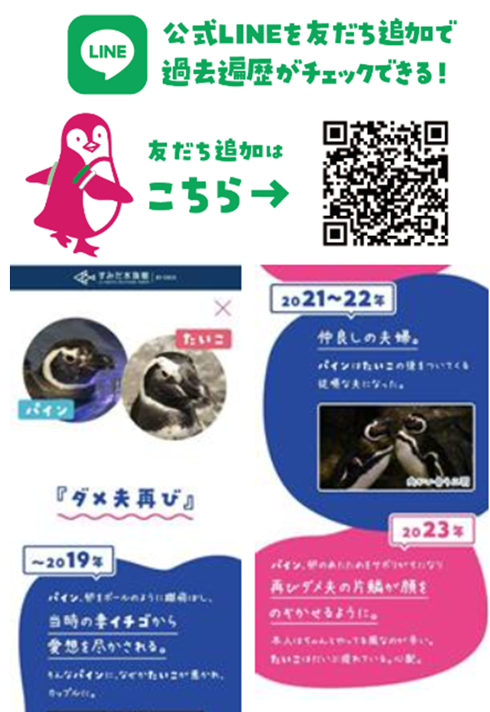 今年は新たに、特徴あるこれまでの遍歴を10件ピックアップし、イベント特設サイトやすみだ水族館公式LINEの自動返信機能によりご紹介します。波瀾万丈の恋愛を乗り越え愛を深めたペアのペンギンから、相変わらず新人の飼育スタッフに厳しいペンギンまで、長年の飼育スタッフの観察ならではの情報ばかりです。