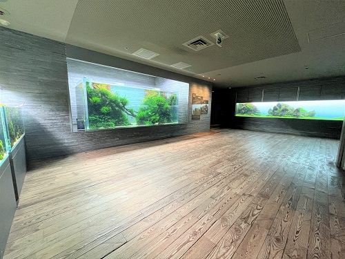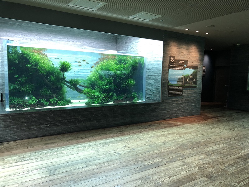 「自然水景」は、すみだ水族館に入館して最初のスペースにある、当館人気の展示エリアです。自然環境の縮図として、いきものだけでなく、水草の植栽、石や流木で構成された美しい自然のようすや、水草が光合成により「酸素の泡」を生み出すようすを見ることができます。水槽の制作・維持管理は、水草育成関連用品メーカー「株式会社アクアデザインアマノ(以下、「ADA」)」が担当し、ADAが手掛けた水槽のある水族館は、当館を含めて世界で3施設しかないことから、世界中の多くのファンの方にお越しいただいています。