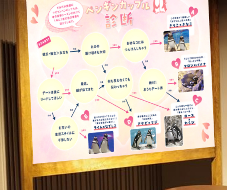 一緒にお越しになったお客さま同士でチャート式の質問に答えることで、自分たちの関係性と似ている「すみだ水族館で暮らすペンギンカップル」が分かる診断ボードを掲示します。診断結果をインフォメーションのスタッフに伝えると、診断結果によって異なる「ペンギンカップル診断アルバム」がもらえます。アルバムには、診断で出たペンギンカップルの特徴や、そのカップルがお気に入りのペンギンプールの場所が記載されており、アルバムを見ながら実際のペンギンカップルを探していただけます。アルバムには写真を入れられるため、すみだ水族館で撮った思い出写真などを入れて、アルバムを完成させることができます。デートやお友だちとのお出かけ、推し活の記念にぜひご活用ください。