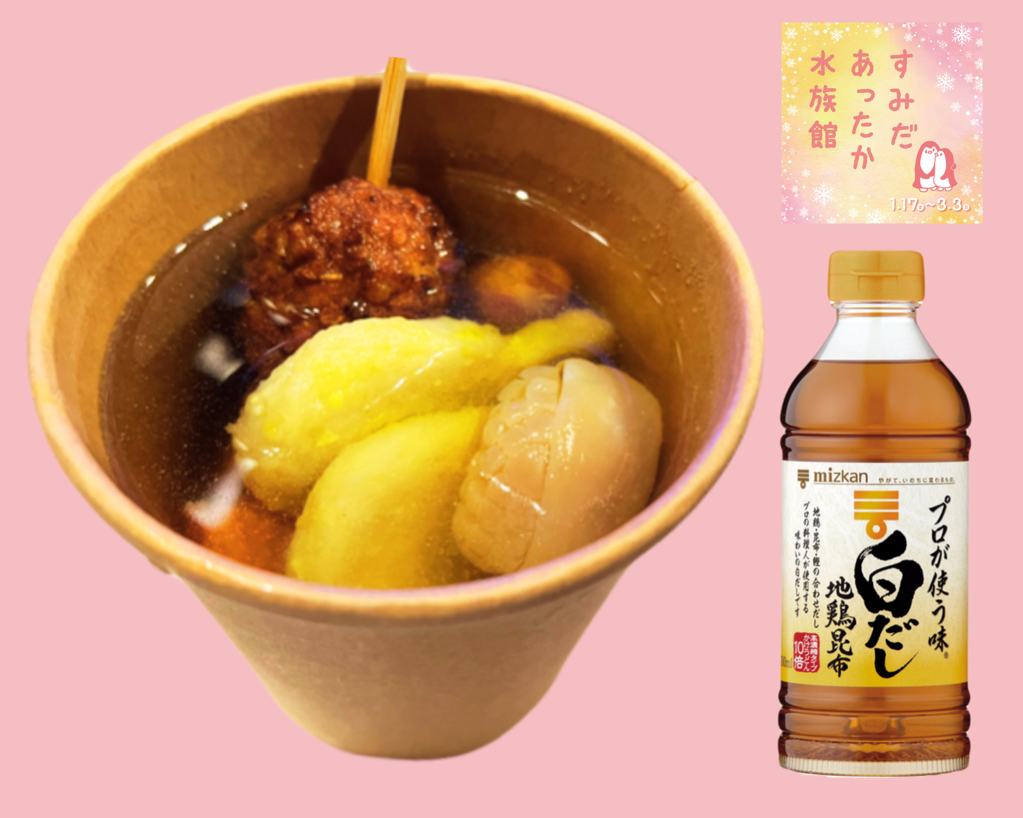 ミュージアムショップでは、一緒に来た方とおそろいにしたくなるような新商品を販売します。また、ペンギンカフェでは、体があたたまるメニューとして「味ぽん®」などの調味料でおなじみのミツカンとコラボレーションした「おでん」やホットドリンクをお楽しみいただけるほか、マゼランペンギン「ぽんず」とミツカン「ぽん酢サワー」がデザインされたオリジナルステッカーがもらえる「冬のぽんずアワー」を実施します。