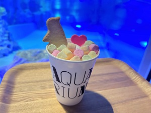 恋をしているすみだ水族館のペンギン(すみペン)たちをイメージしたホットココアです。あたたかいココアの上に、ホイップクリーム、カラフルマシュマロ、ペンギンクッキー、ハートのチョコレートをトッピングしました。デートシーンにもぴったりな可愛らしいドリンクです。