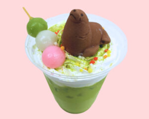 お花見をイメージした春らしい色合いのアイス抹茶ラテです。まろやかな抹茶ラテにホイップクリーム、ミニ三色団子、カラフルなぶぶあられ、そして愛らしいオットセイのマシュマロをトッピングし華やかに仕上げました。ぜひご賞味ください。