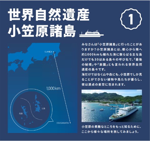 「小笠原諸島」は、都心から南へ約1,000kmの太平洋上に散在する30余りの島々の総称です。一度も大陸と陸続きになったことがない海洋島であり、多くの固有種・希少種が生息・生育し、特異な島しょ生態系を形成しています。このことが評価され2011年には世界自然遺産に登録されるなど、世界的にも貴重でかけがえのない自然の宝庫です。すみだ水族館では、2012年の開業時より、小笠原の海を再現した「小笠原大水槽」の展示や「アオウミガメの赤ちゃんの保全活動」に加え2023年には小笠原の情報発信拠点「オガサワラベース」を公開など、東京にある世界自然遺産の魅力を多くの方に知っていただくための活動に取り組んでいます。