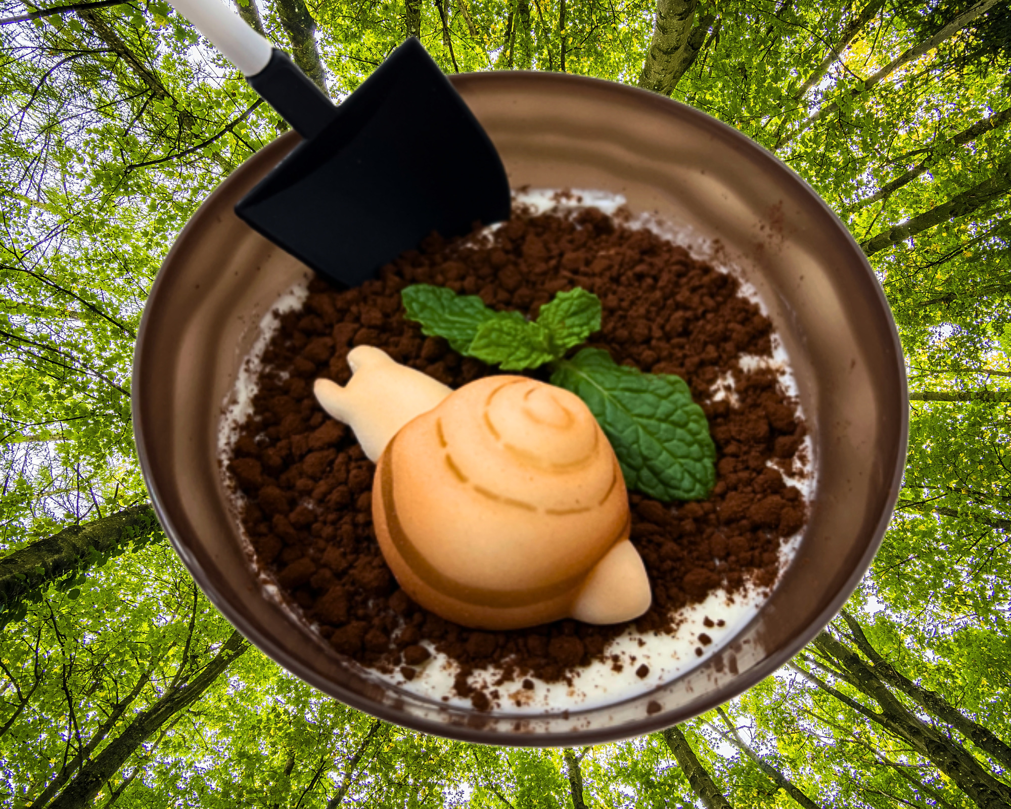小笠原で暮らすマイマイをイメージしたチーズケーキ。ふわふわのスポンジケーキにレアチーズクリームと、土に見立てたクラッシュクッキーの上にマイマイ型マシュマロをトッピングしました。植木鉢風の入れ物とスコップ型のスプーンでお召し上がりください。