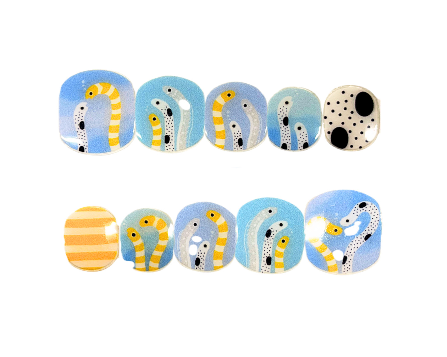 爪に貼るだけでチンアナゴたちのネイルアートを楽しめるシールです。大きめサイズと小さめサイズが1シートに入っているので、ご家族で一緒にご使用いただけます。