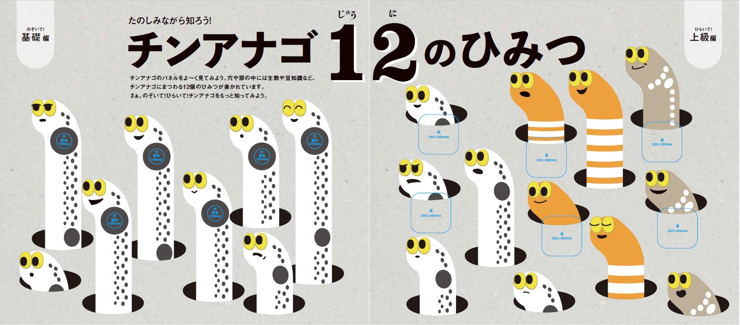 「チンアナゴ12のひみつ」パネルでは、チンアナゴの生態に関する豆知識を初級編と上級編の12個のクイズで紹介します。初級編では「チンアナゴたちは何を食べる?」など、上級編では「どこからウンチをする?」など、あなたの知らないチンアナゴの世界を知ることができます。