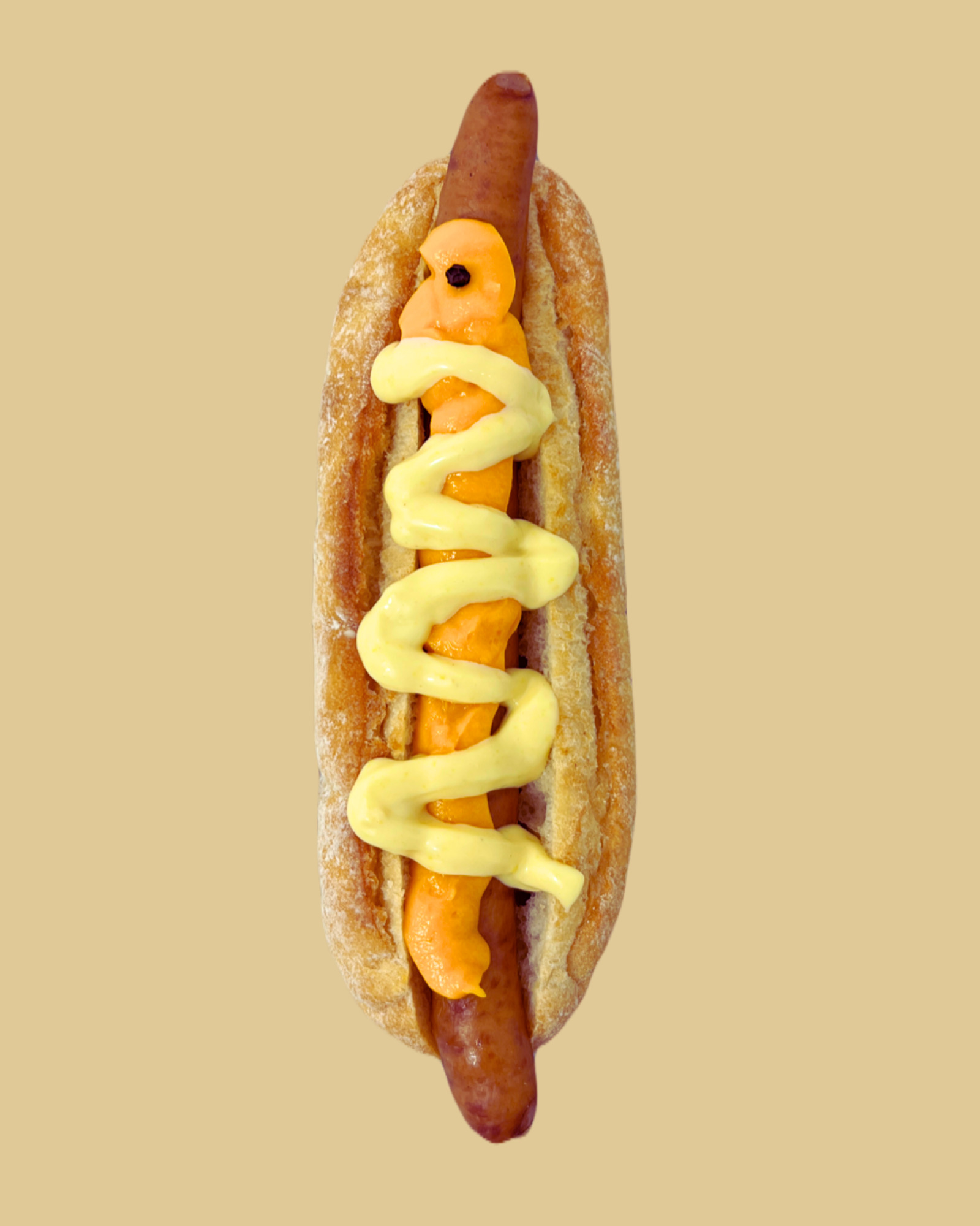まるでニシキアナゴのような色合いのホットドッグ。11月11日はチーズの日であることにもちなみ、5種のチーズソースでニシキアナゴの模様を表現しました。