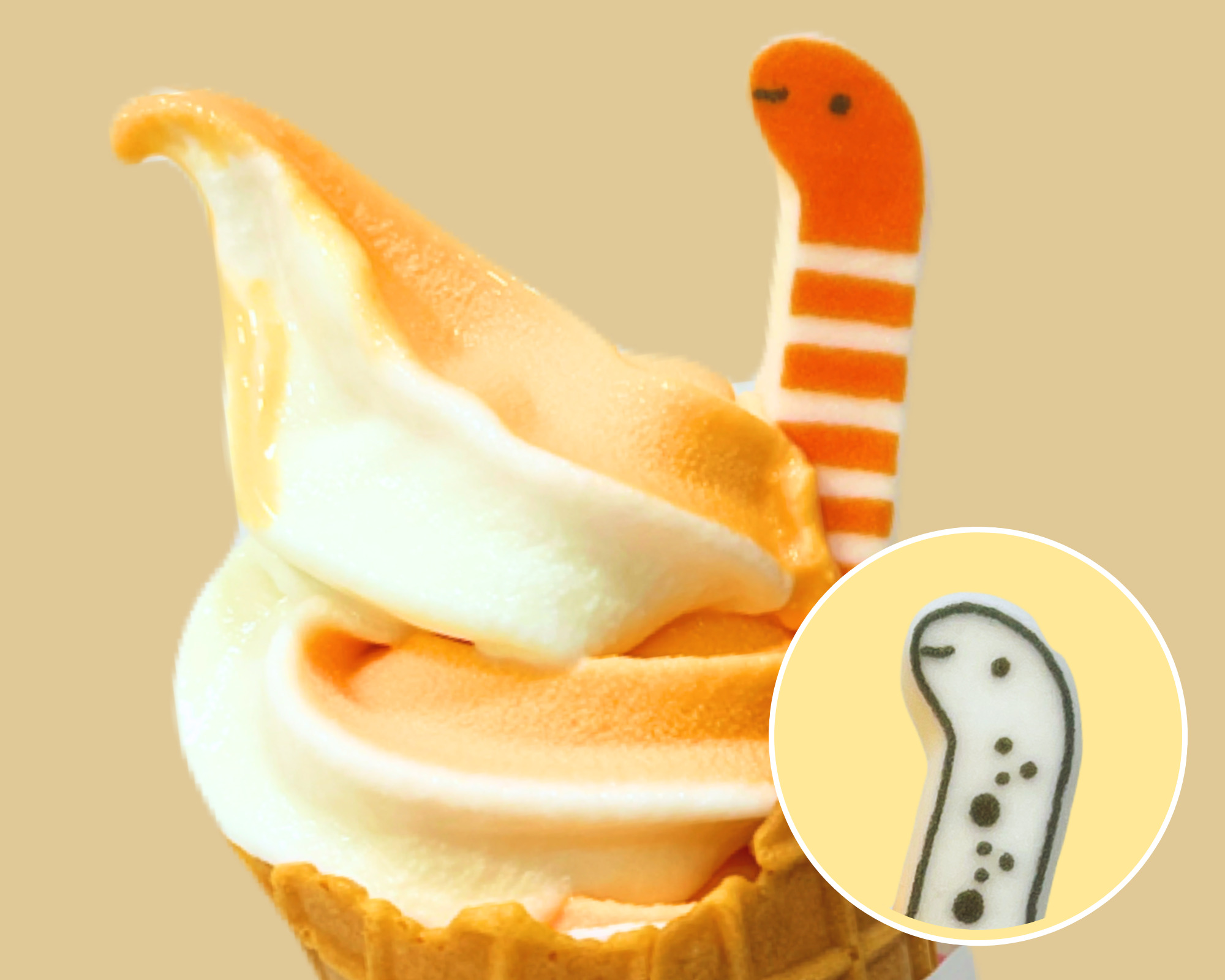 まるでニシキアナゴのような色合いのソフトクリーム。北海道産のミルクと夕張メロンの濃厚かつフルーティーな味わいです。ランダムでニシキアナゴかチンアナゴのマシュマロをトッピングします。