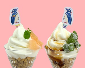 新たに夫婦になった「ピーチ」と「おもち」をイメージした2種類のミニパフェです。グラノーラと塩バニラソフトをベースに、「ピーチ」は果肉入りの白桃ソースを、「おもち」はもちもちのタピオカ風おもち「タピもち」と黒みつをトッピングしました。2種類を並べると「ピーチ」と「おもち」が向かい合い、ラブラブに見えるピック付きです。ミニサイズなので1人で2種類を食べても、2人でシェアしても楽しめます。クリスマスやバレンタインのデートにもおすすめの、かわいらしいパフェです。