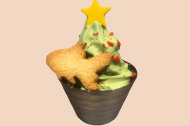 クリスマスツリーをイメージしたサンデーです。ピスタチオ味のソフトクリームに金魚のクッキーと星型チョコ、いちごクランチをトッピングしました。