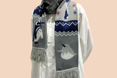 落ち着いたグレーとネイビーの北欧柄をベースにペンギンとペンギンのヒナを編み込みました。当館限定のオリジナルグッズです。ご来館の思い出やクリスマスギフトにおすすめです。