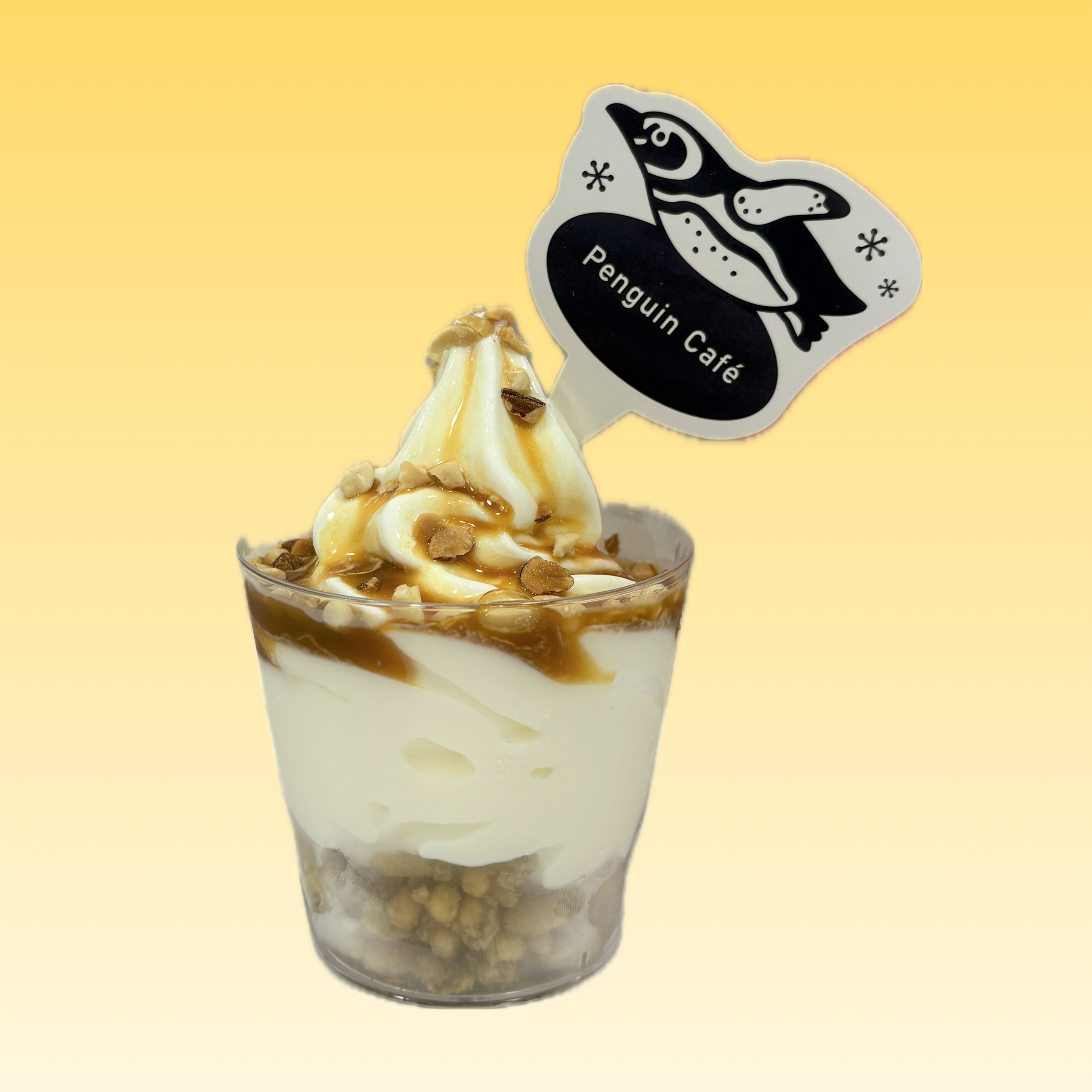 グラノーラと当館オリジナルの塩バニラソフトをベースに、アルゼンチンの伝統的な糖菓をイメージしたキャラメルソースとナッツをかけたサンデーです。ペンギンたちを眺めながらぜひお楽しみください。